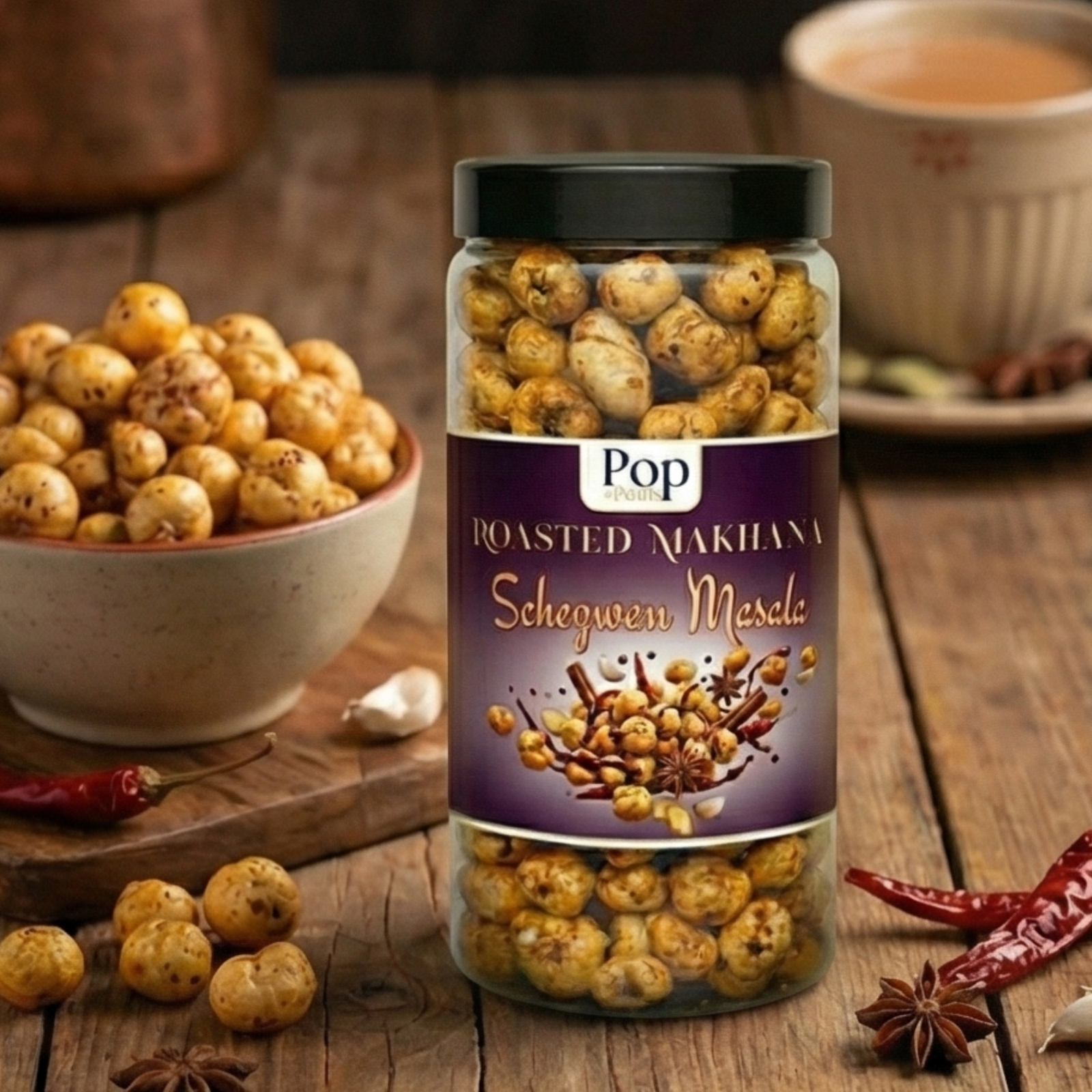 Turn up the heat with Pop & Pearls Schezwan Masala Roasted Makhana — a fusion of Indian spices and classic Indo-Chinese Schezwan flavour.